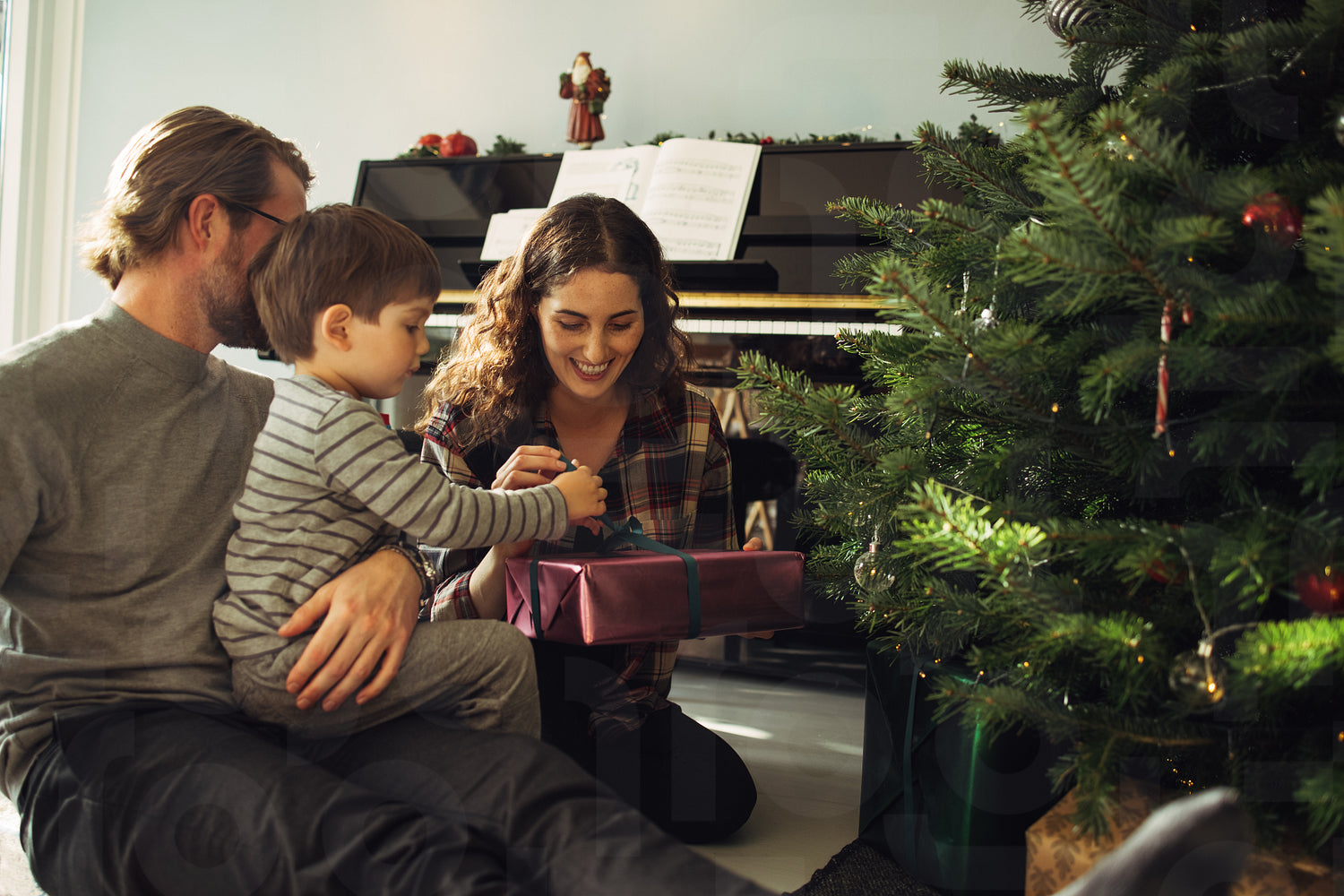 Boy opening his Christmas gift sitting with parents. Small family sitting near Christmas tree unboxing gifts.