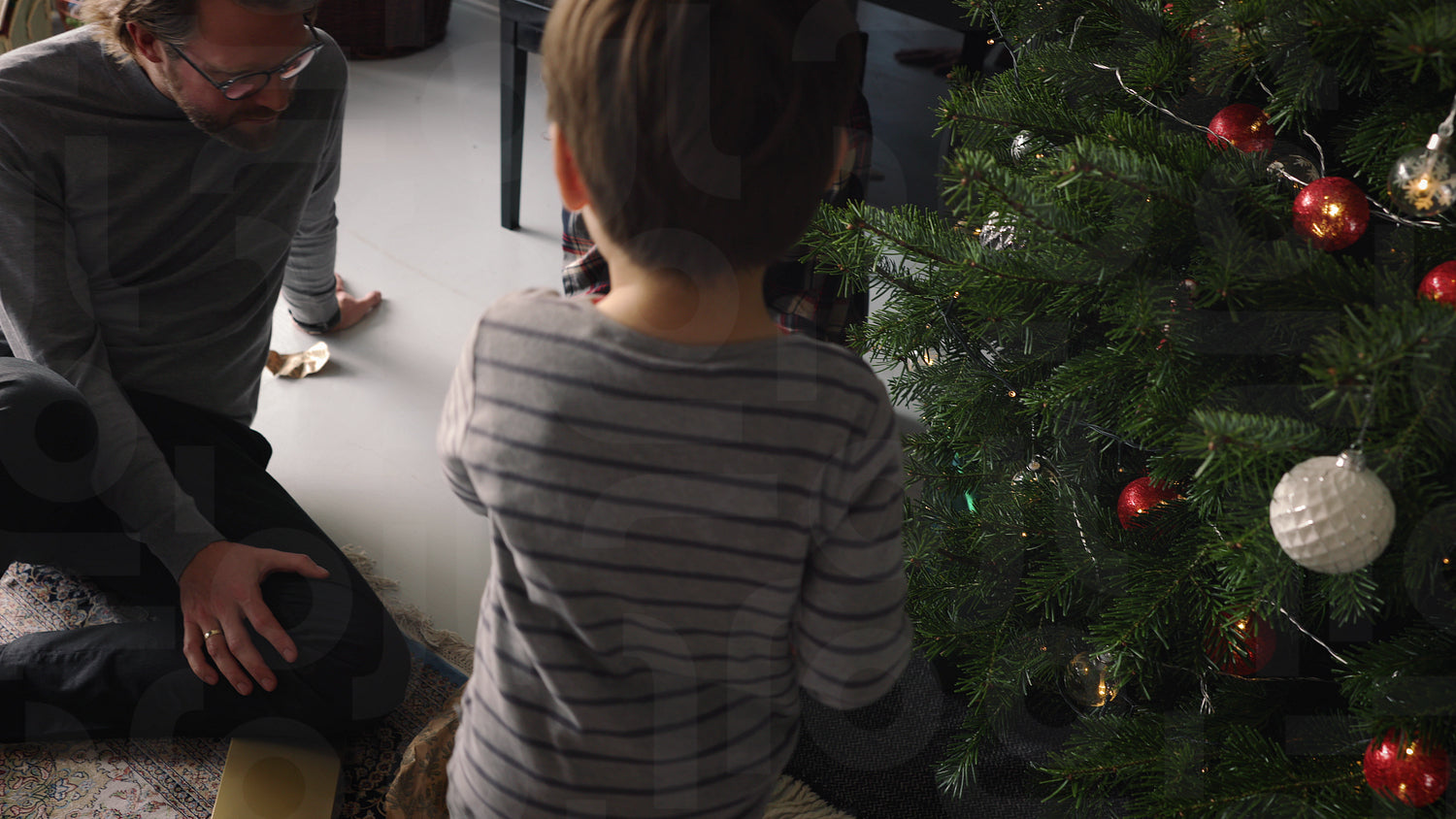 Kid looking for his gift under Christmas tree. Decorated Christmas tree and gift boxes in family home.