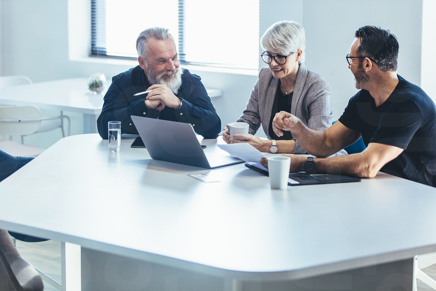 Business people discussing new business plan. Mature manager planning new strategy with colleagues in meeting.