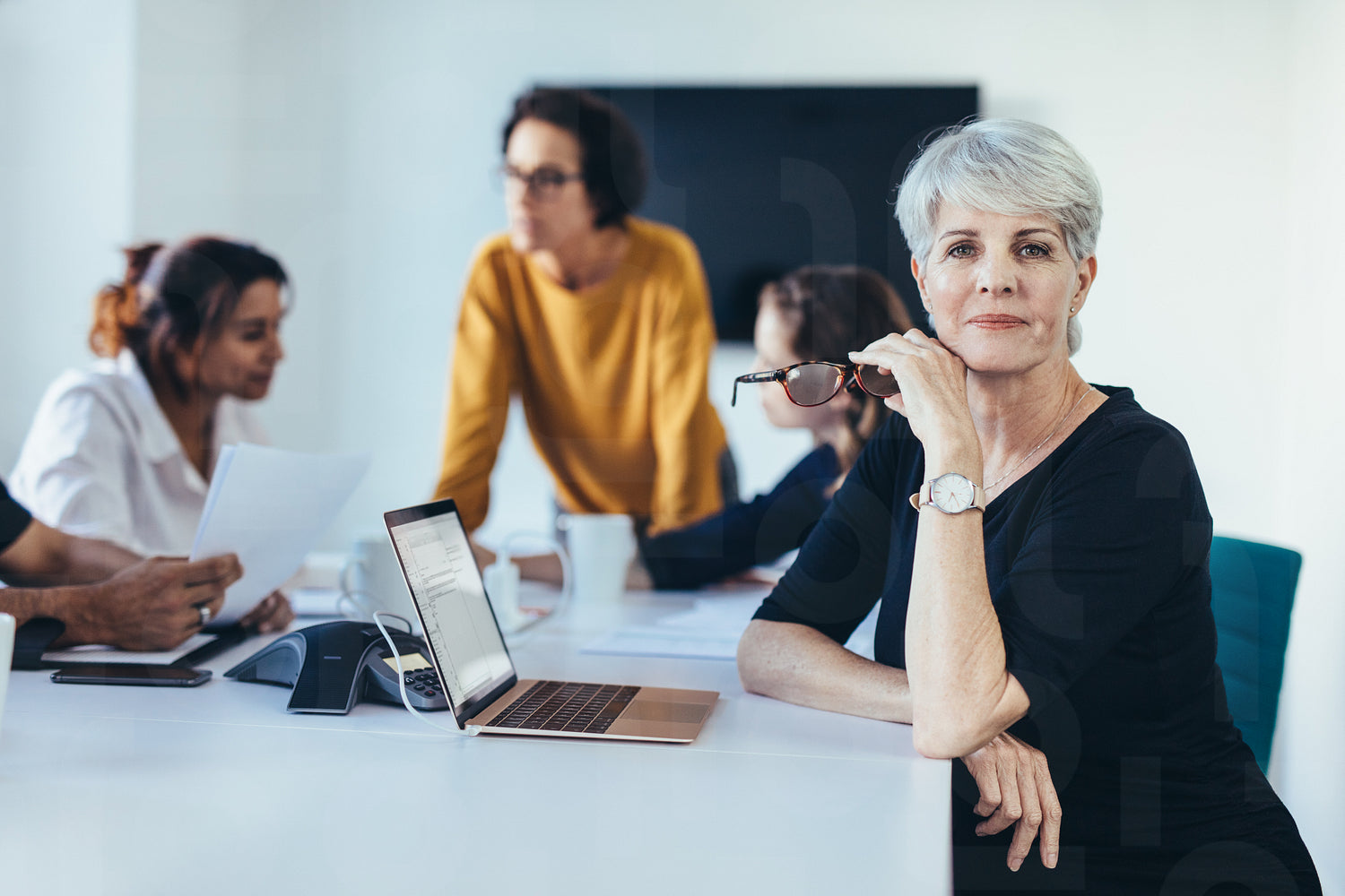 Mature business woman in meeting room with colleagues discussing in background. Confident female professional at board room meeting.