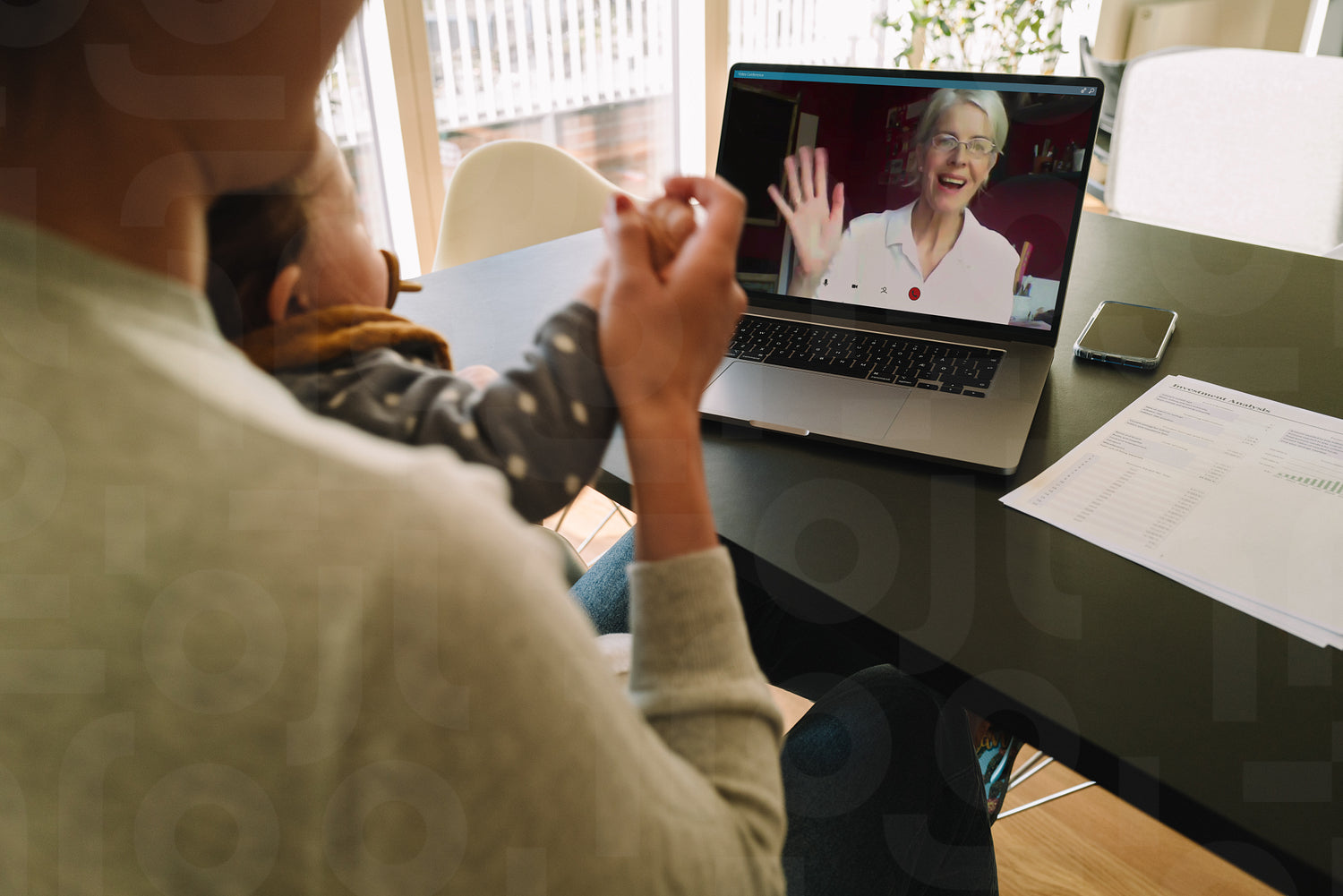 Woman with her daughter having video call with her mother. Woman connecting with her mother on a video call while at home.