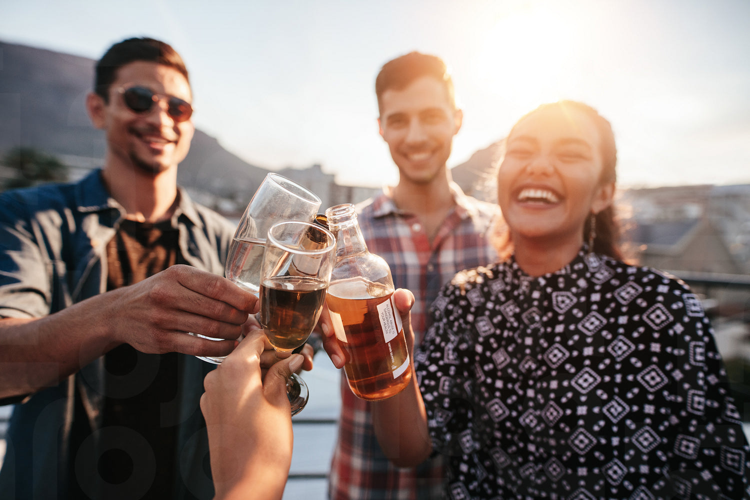 Young friends partying together. Group of people toasting drinks in a rooftop party.
