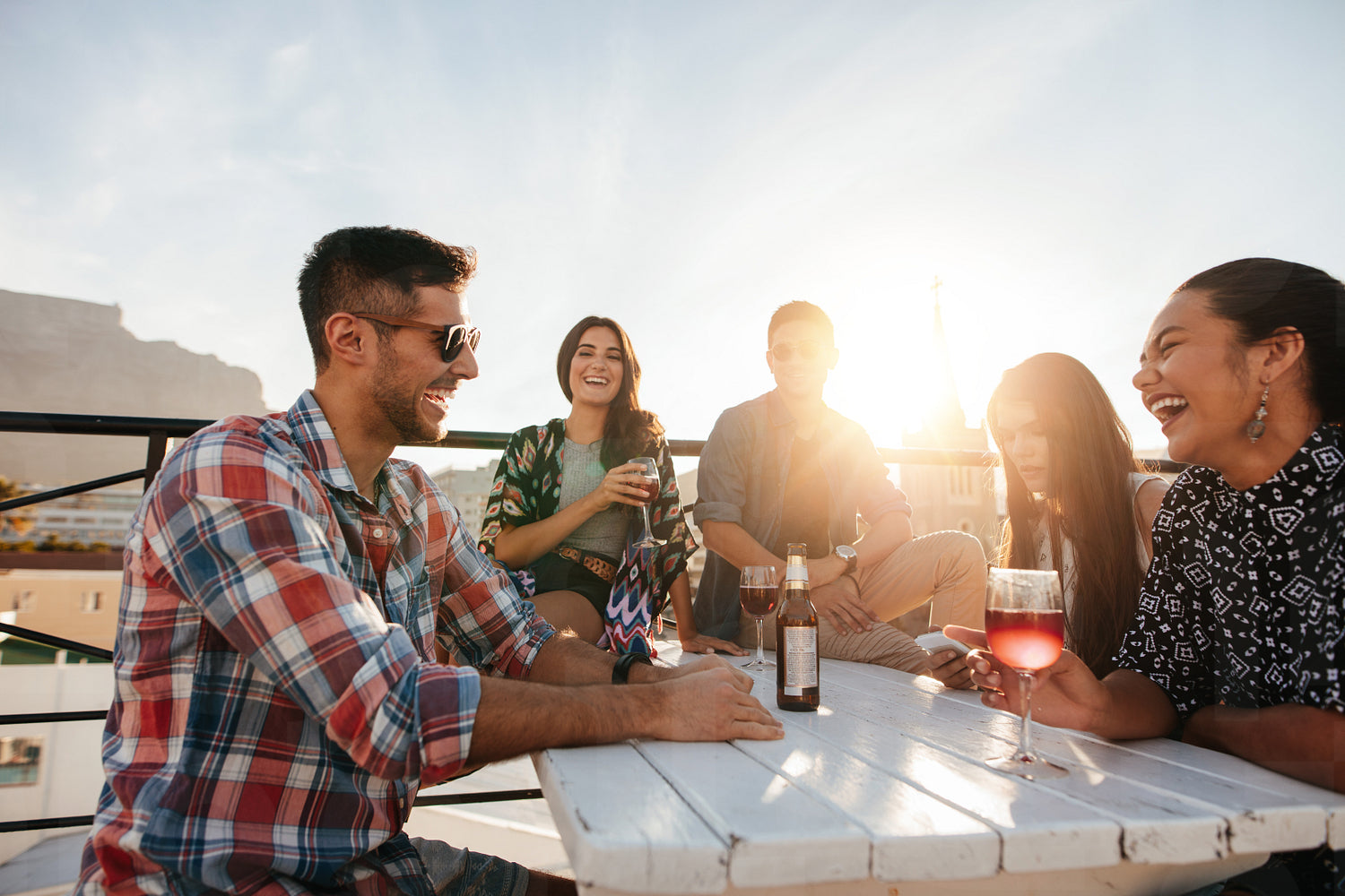 Multiracial group of friends having cocktail party on the rooftop. Young men and women sitting around table with drinks and laughing.