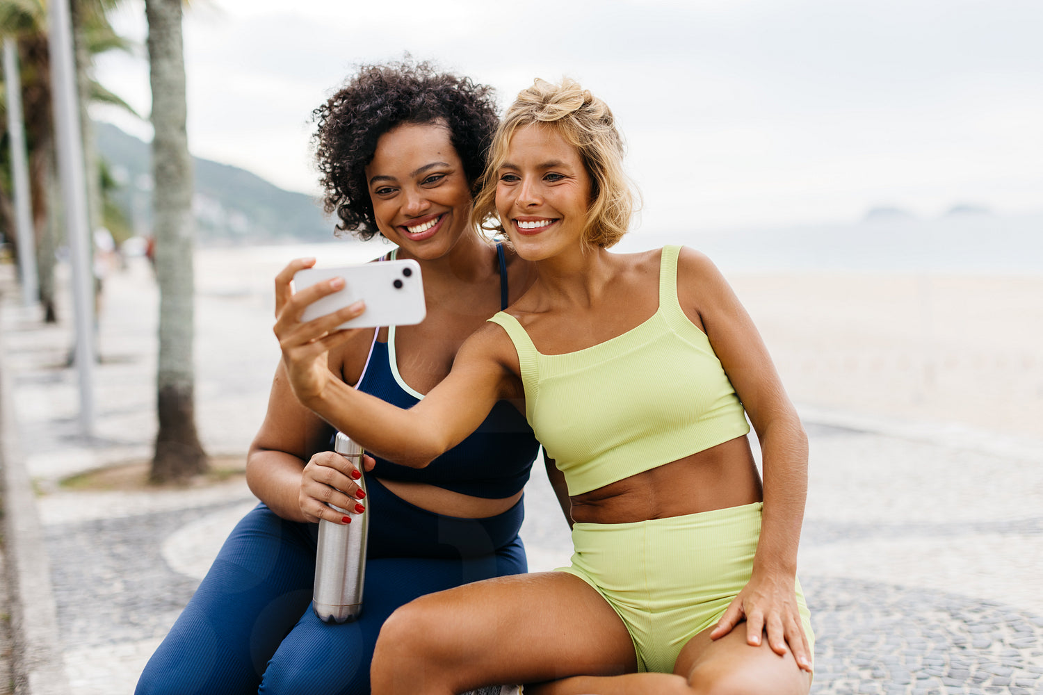 Beach workout vibes: Fit women taking a selfie on the beach promenade