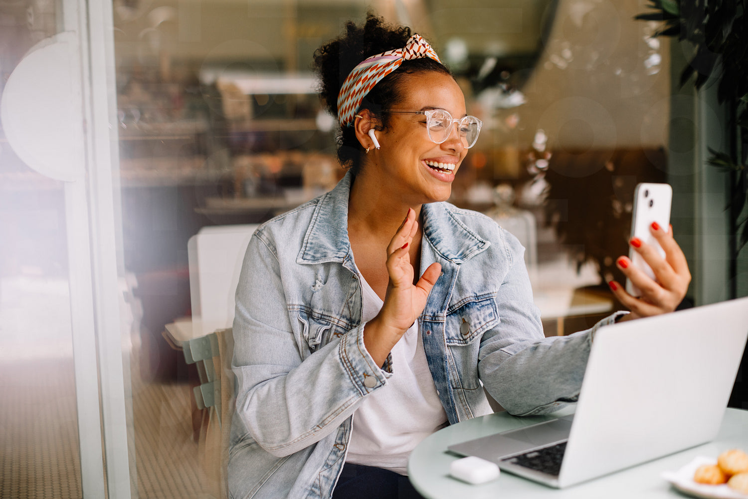 Happy businesswoman sits in a cafe, using her laptop and phone for remote work. She smiles and waves during a video call, portraying the real emotions of a successful freelancer.
