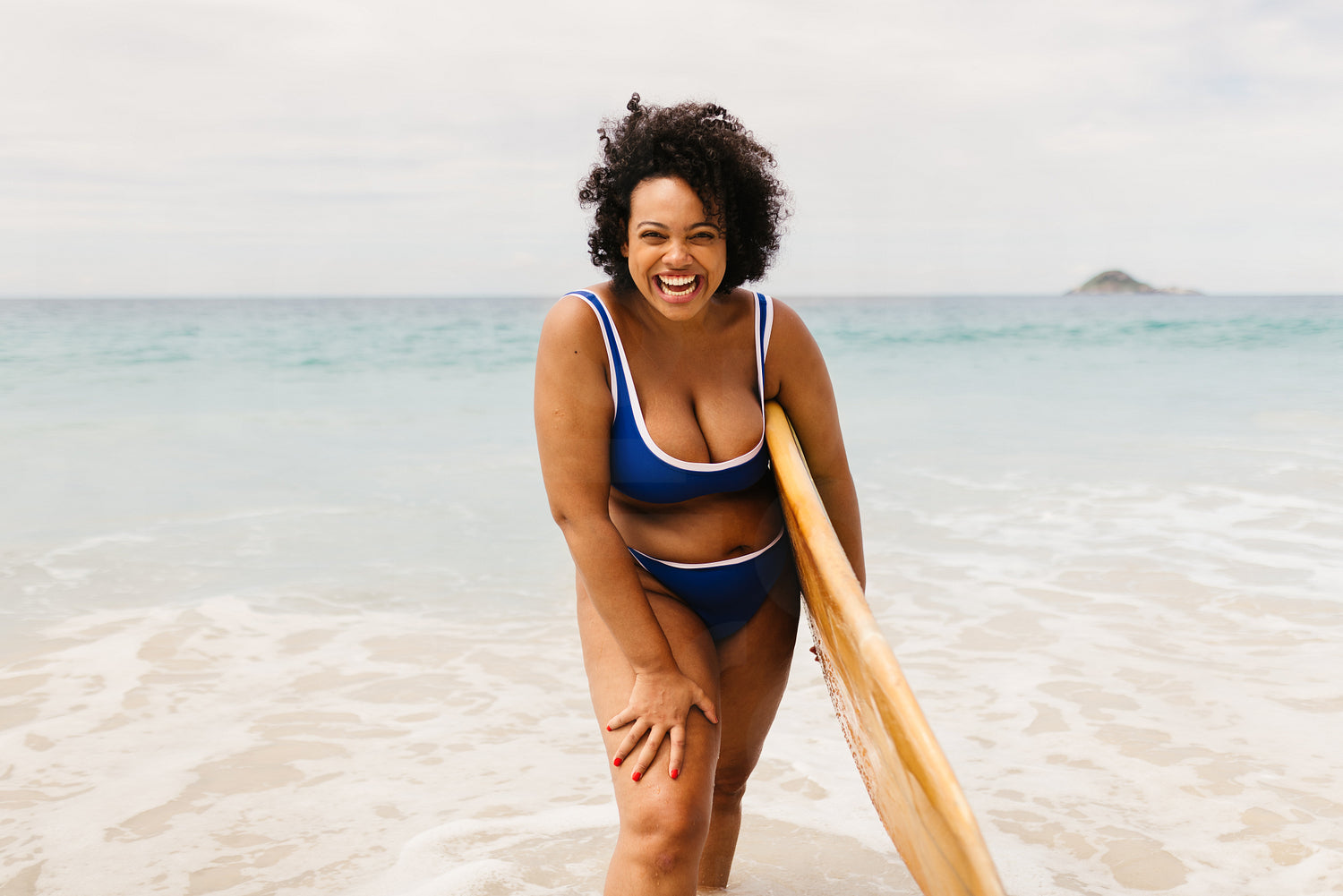Young female surfer having fun on a beach adventure, holding her surfboard and wearing a vibrant bikini. Curvy woman smiling at camera, enjoying an active lifestyle and solo summer fun.