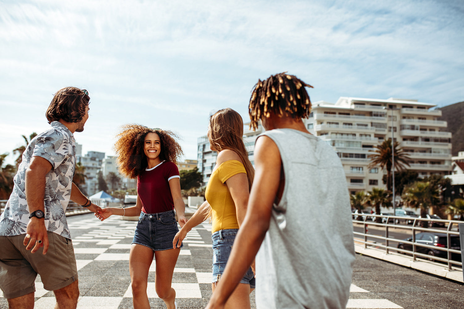 Beautiful woman walking with friends outdoors holding hands. Group of multi-ethnic men and women having fun together outdoors.