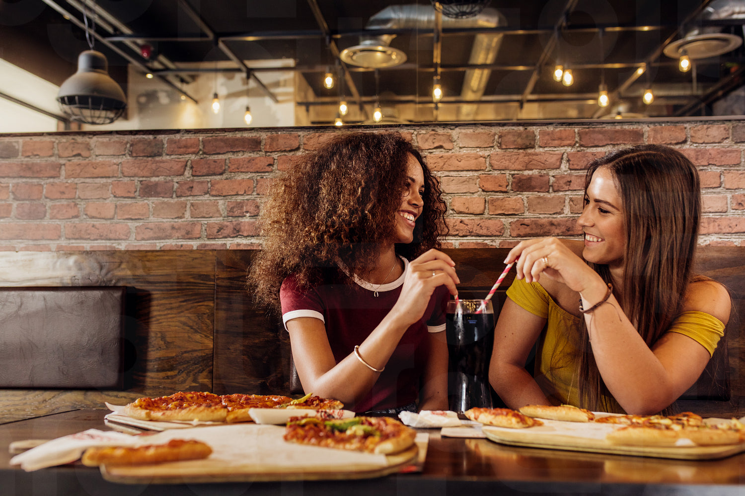 Two young women with pizza and cola on table at fast food restaurant. female friends in a restaurant looking at each other and sharing a cold drink with two straws.
