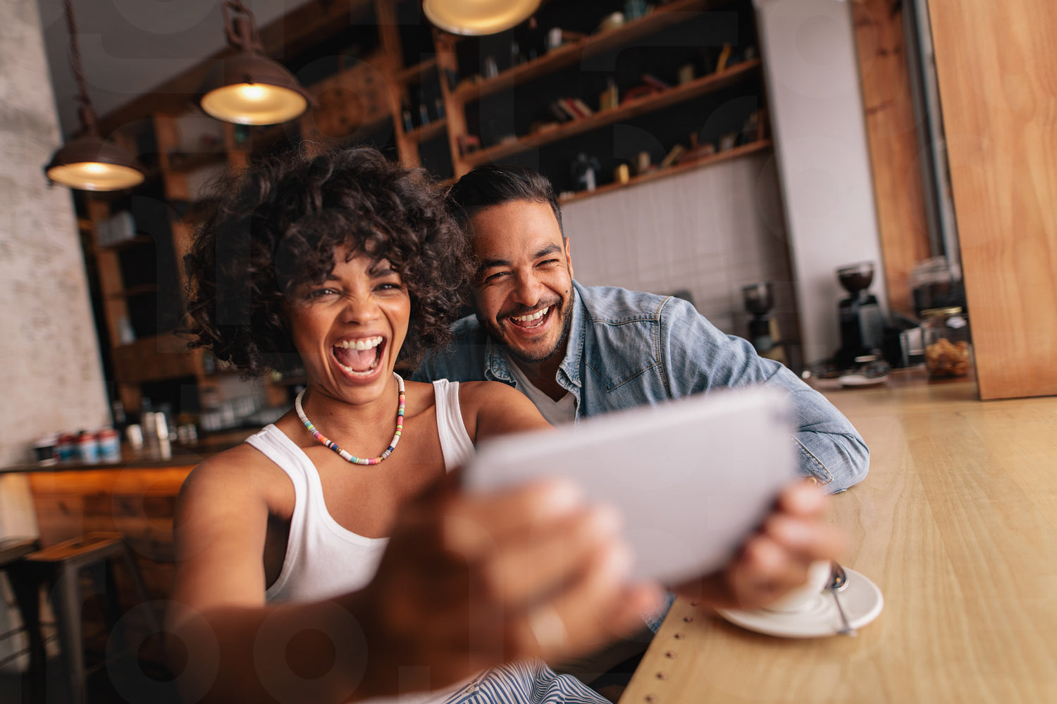 Happy young couple sitting together at cafe and taking selfie using mobile phone. African woman with her boyfriend taking self portrait with smart phone.