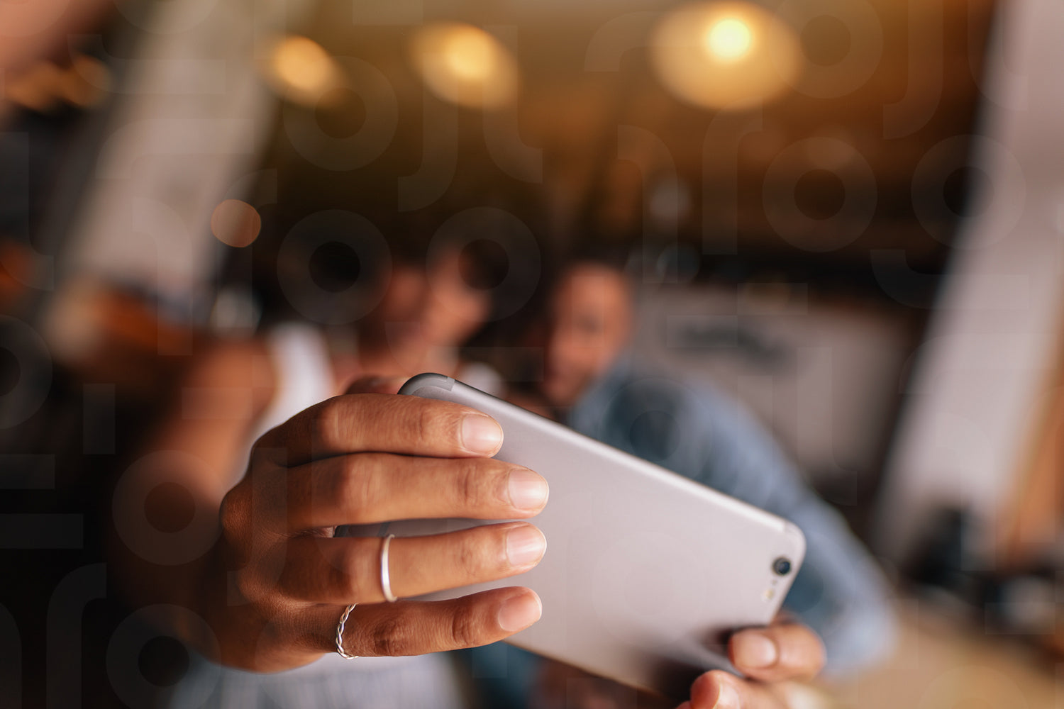 Close up of female hands holding smart phone and taking selfie. Young woman taking selfie with mobile phone while sitting at cafe with her boyfriend. Couple taking self portrait with smart phone. Focus on mobile phone in woman's hands.