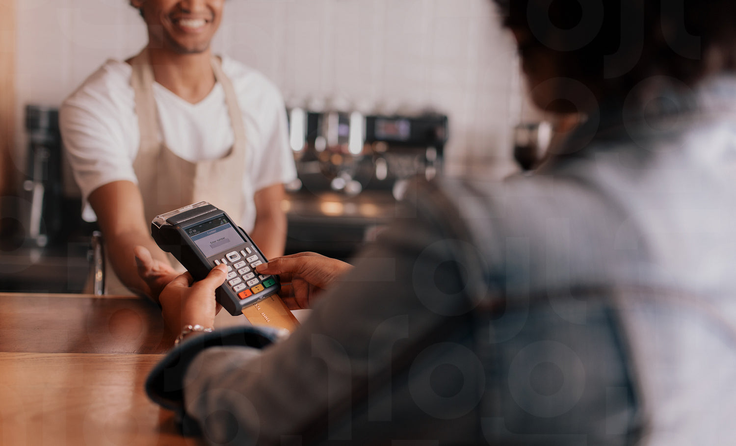 Cropped shot of customer entering pin number into machine at counter in cafe. Focus on woman hands entering security pin in credit card reader.