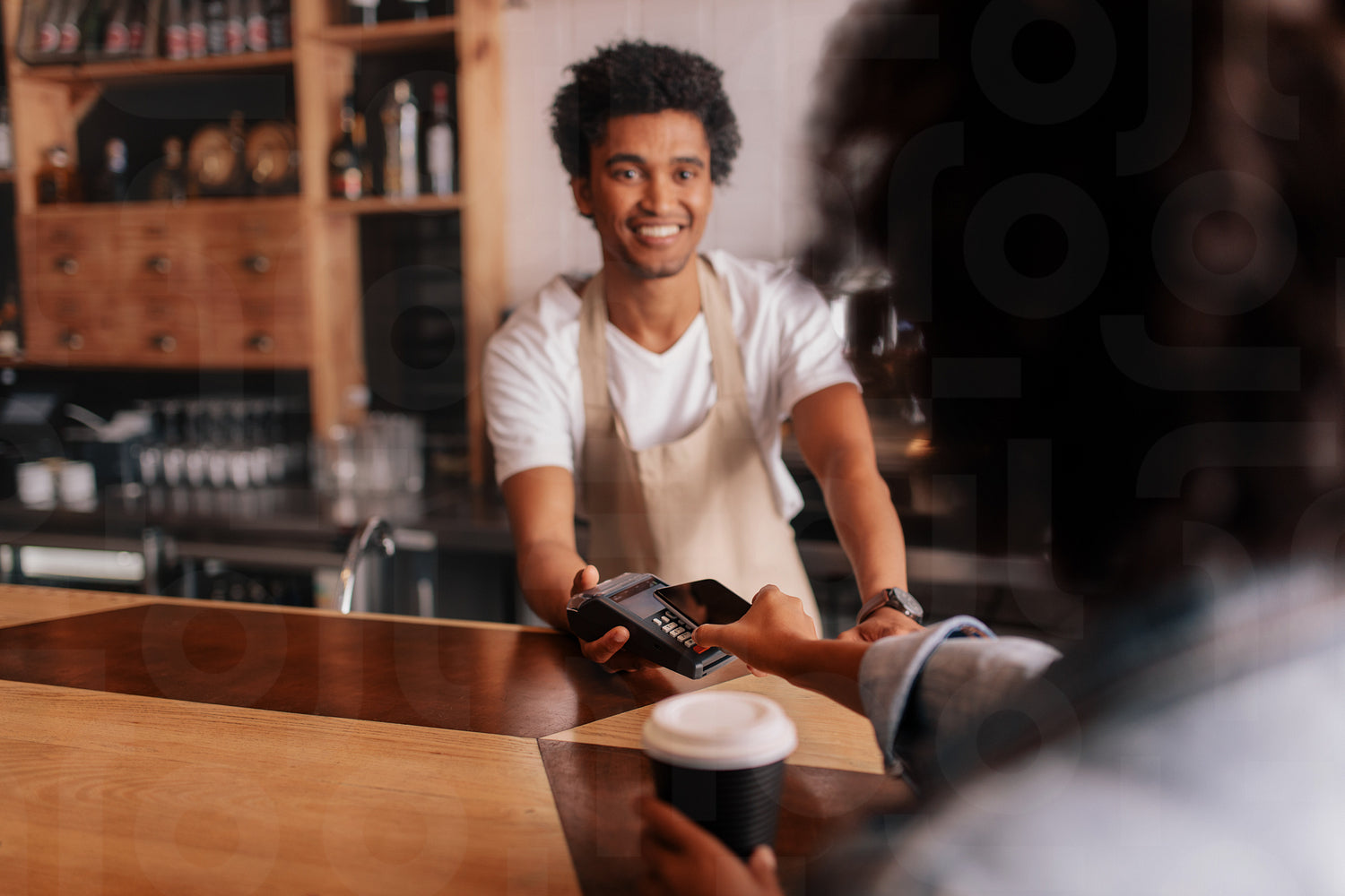 Customer making payment through mobile phone at counter in cafe