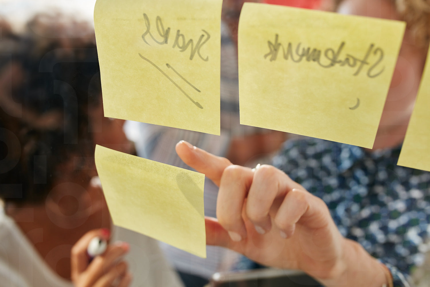 Hand of businesswoman pointing at a sticky note on a glass wall while standing with coworkers in office. Focus on female finger.