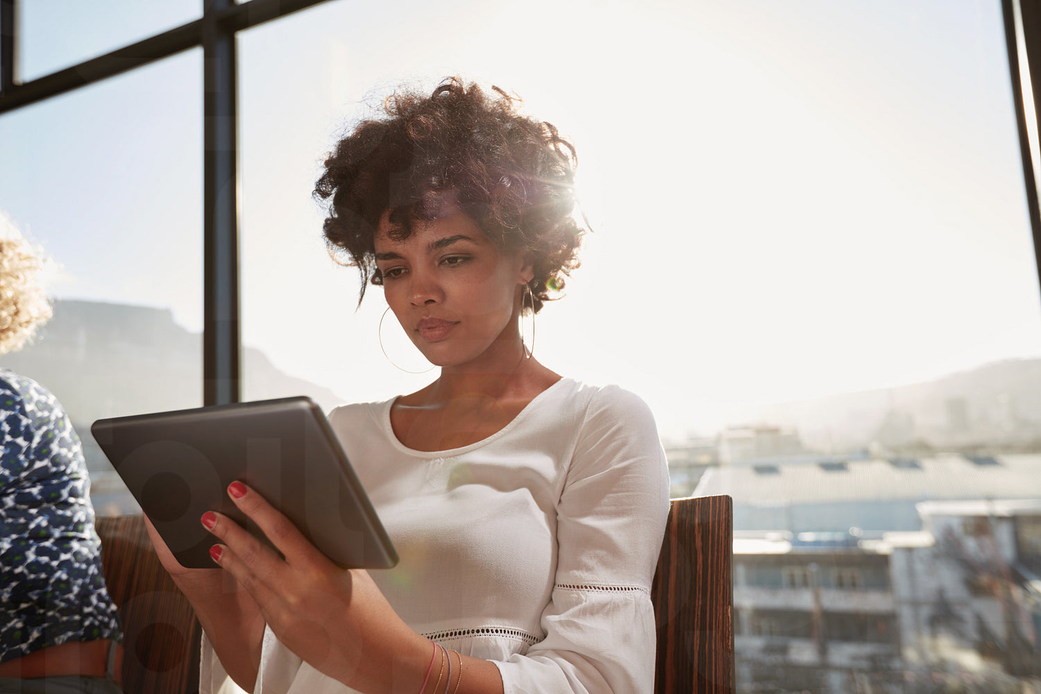 Portrait of young woman busy working on digital tablet on a sunny day. Attractive african woman surfing internet on tablet computer at office.