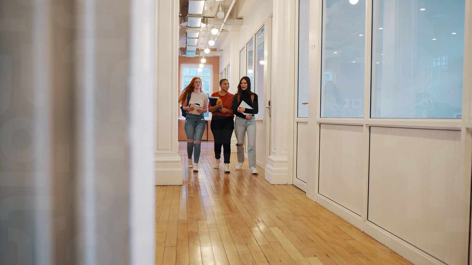 Group of female students after lecture in college campus. Smiling girls with books walking through college corridor after their class.