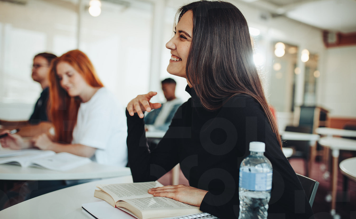 Female student sitting in college classroom and smiling during lecture. Woman attending a lecture in university classroom.