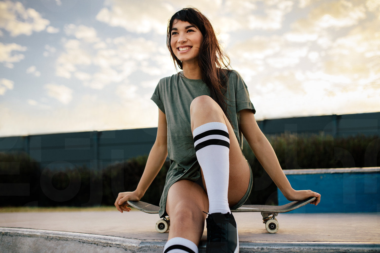Attractive woman sitting on the skateboard and looking away smiling while spending time at the skate park. Urban girl relaxing at skate park.
