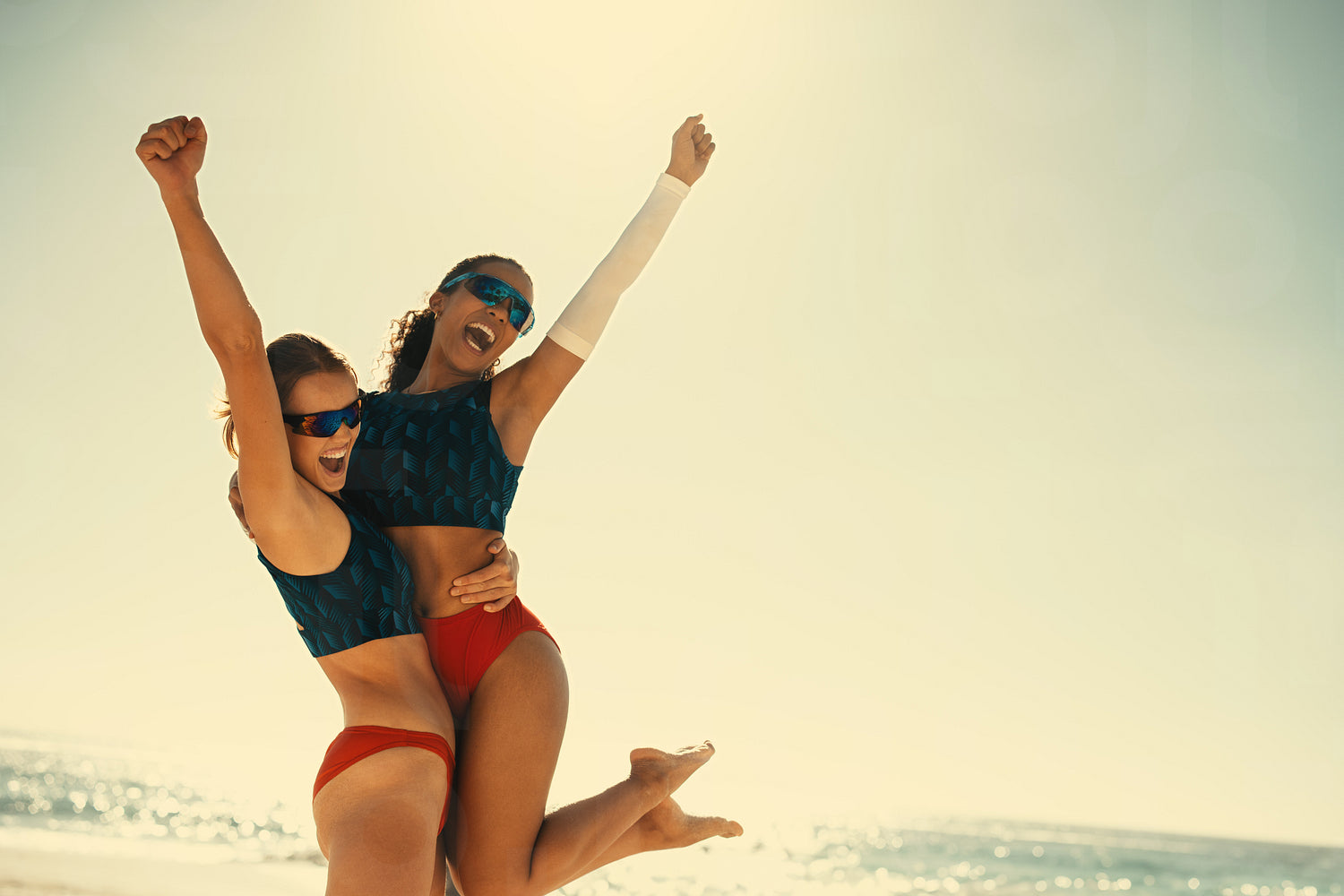Winning team celebrating victory in a coastal summer game