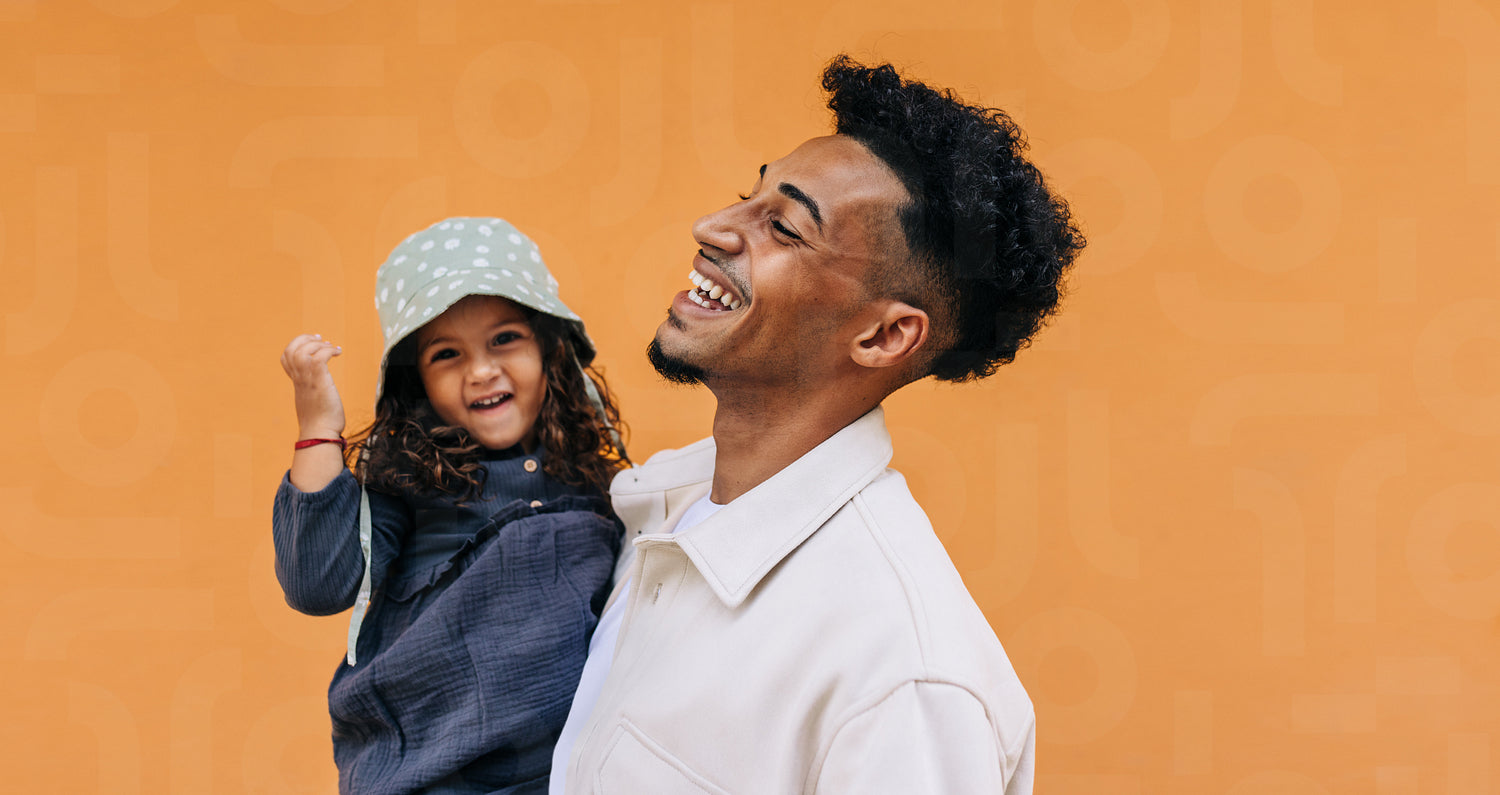 Happy young dad laughing joyfully while carrying his daughter in a studio. Cheerful single father celebrating father's day with his adorable daughter. Dad and daughter standing against a studio background.