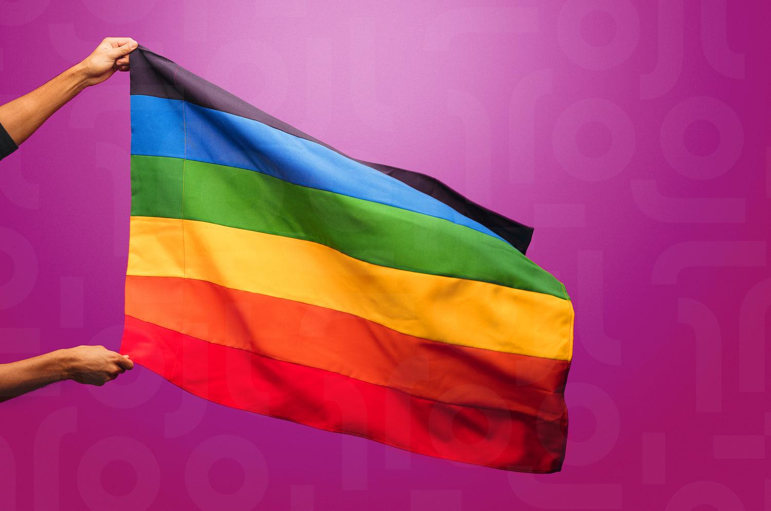 Cropped shot of hands holding gay pride flag against purple background. Rainbow colored lgbt pride flag.
