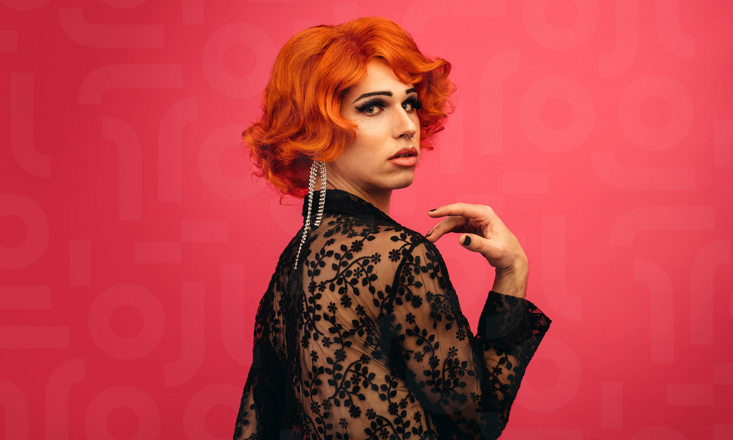 Man dressed as woman looking over his shoulder. Glamarous drag queen against red background.