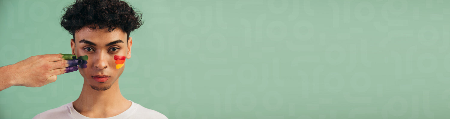 Portrait of young man with face painted with rainbow flag of gay pride. Hand painting lgbt rainbow color on a man's face against green background with copy space.