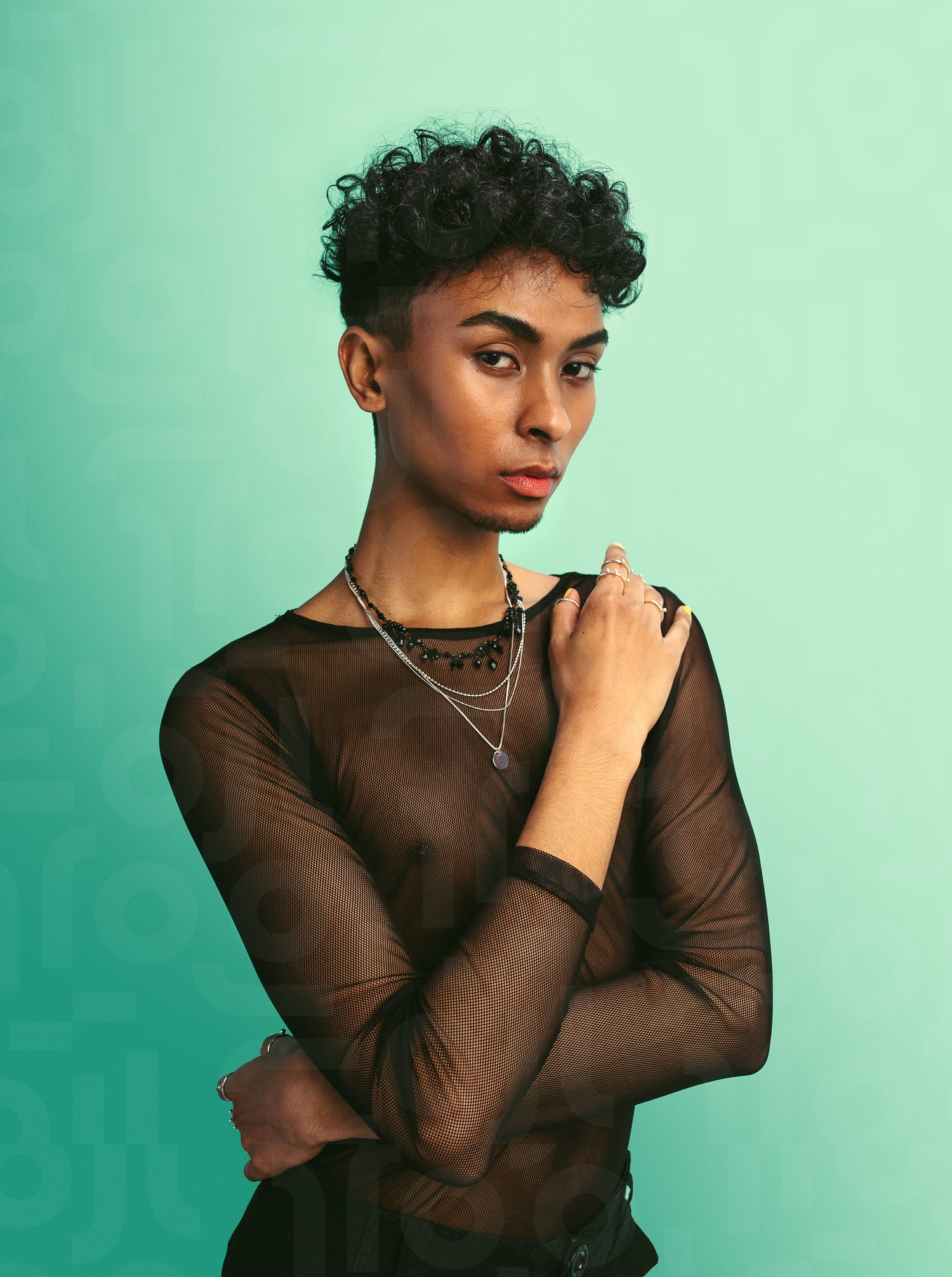Androgynous man in black mesh t-shirt. Transgender man posing against blue background.