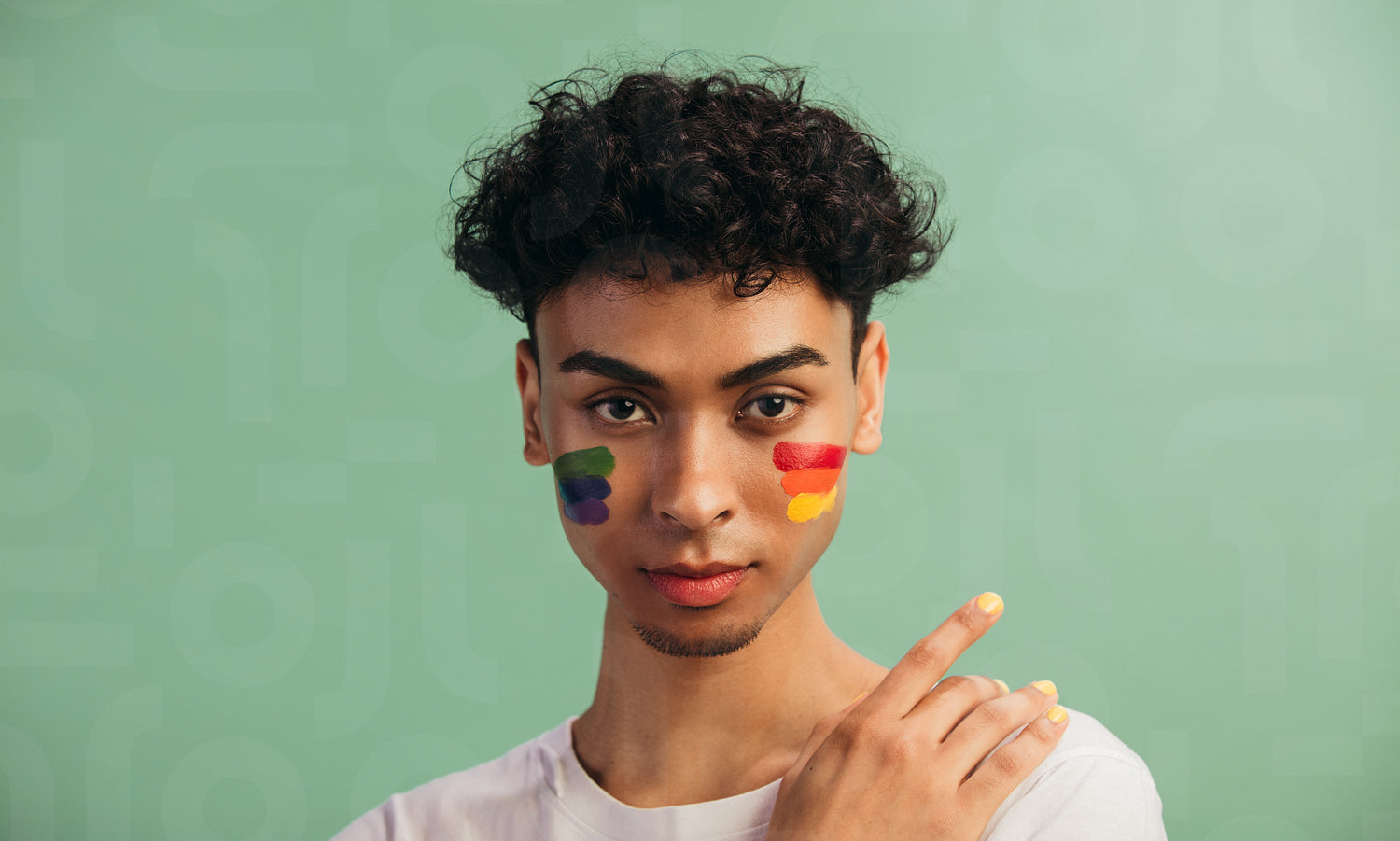 Portrait of a young man with LGBT flag painted on his cheeks. Theme of equality and freedom of choice.