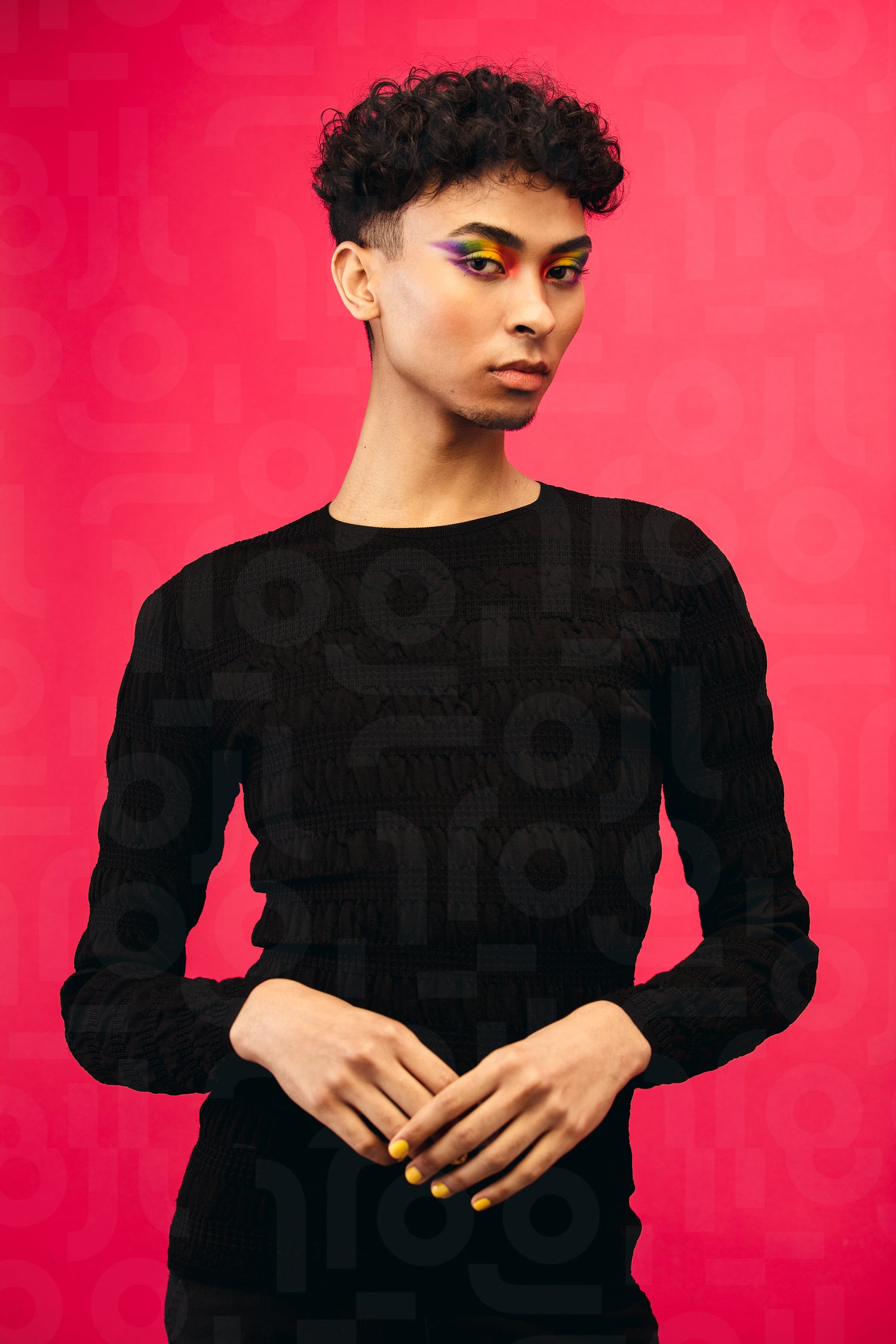 Portrait of a gay man in black t-shirt. Gender fluid man wearing black outfit posing against red background.