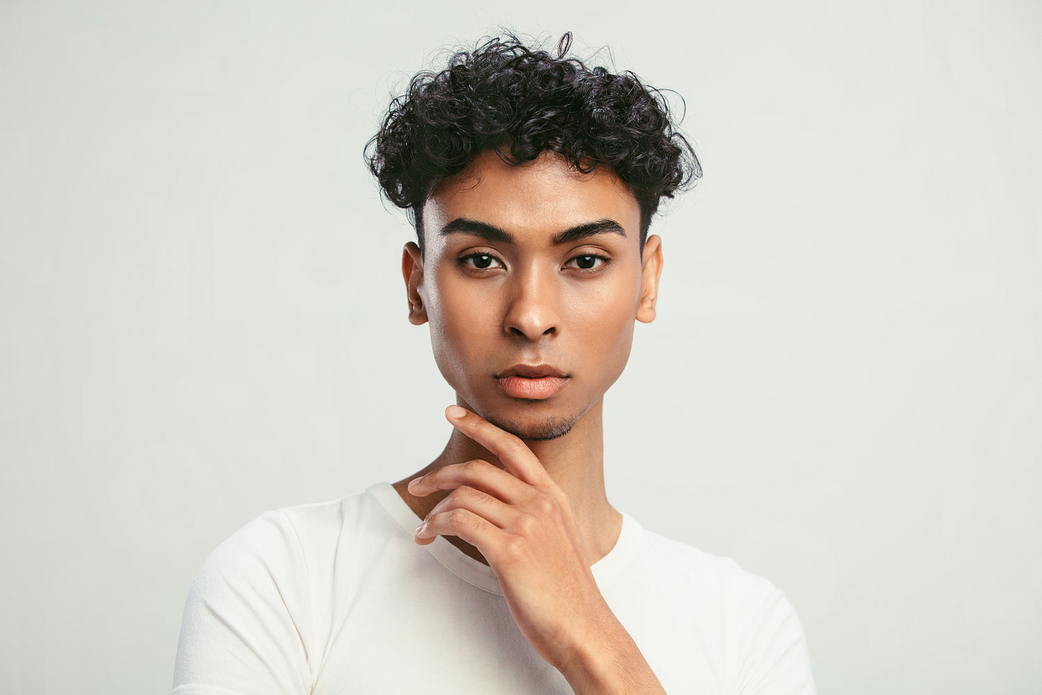Close-up of an androgynous man with his hand on chin. Young guy with feminine facial features looking at camera against white background.