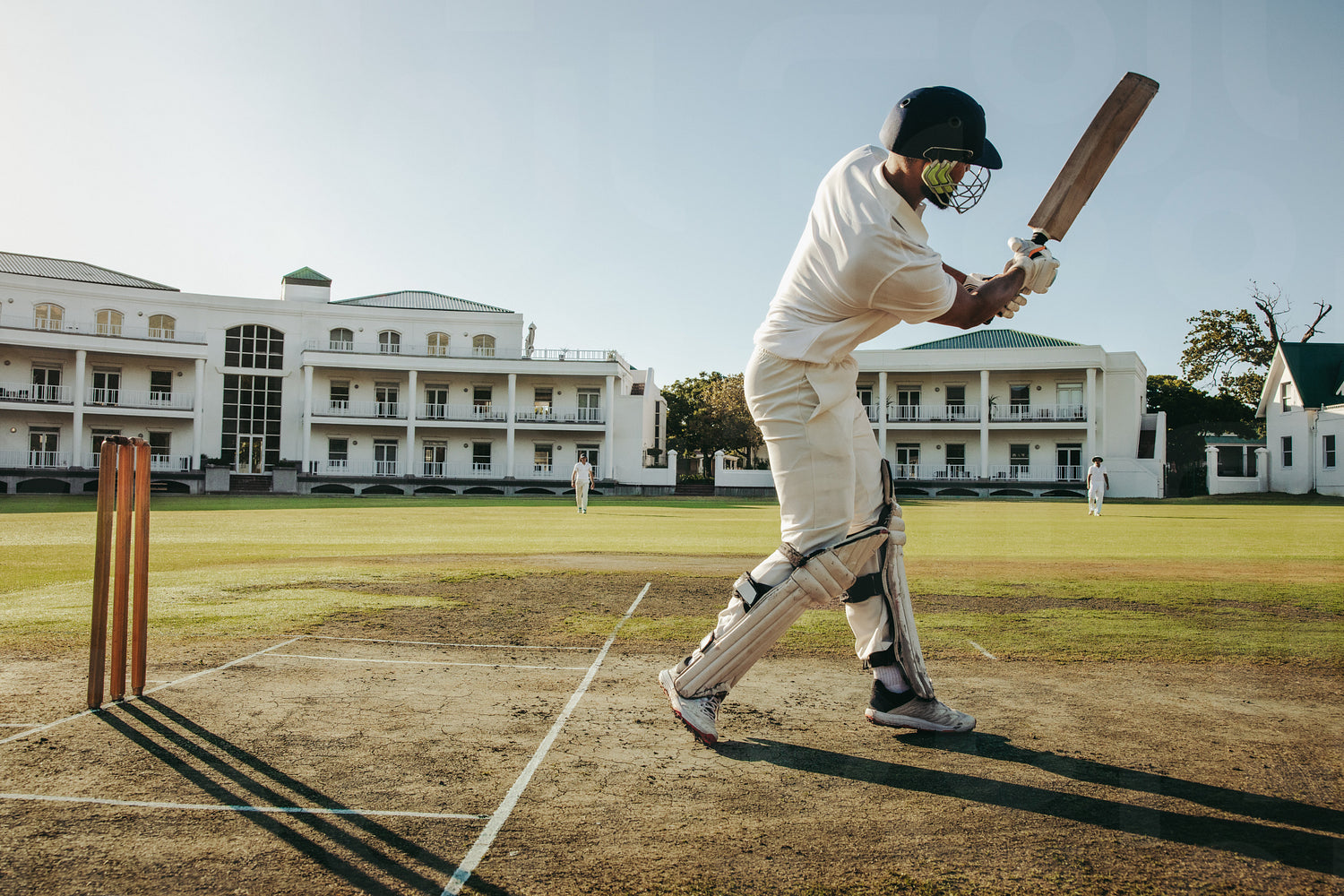 A man in cricket gear bats during an outdoor match, showcasing professional sports action in a sunny setting.