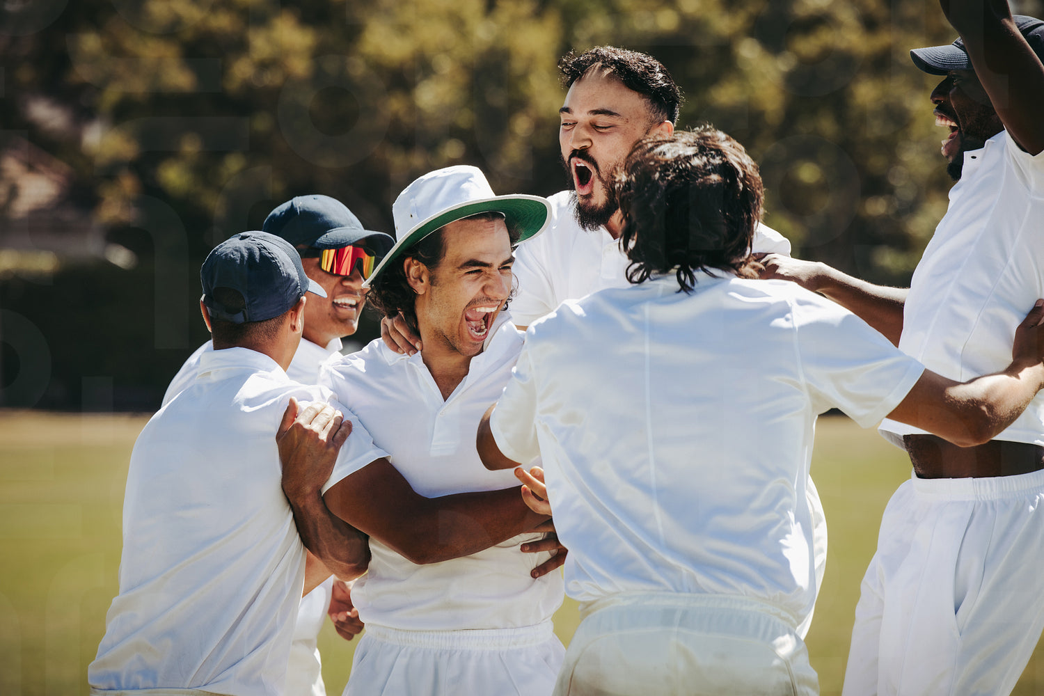 Cricket players celebrating their victory with excitement and teamwork outdoors