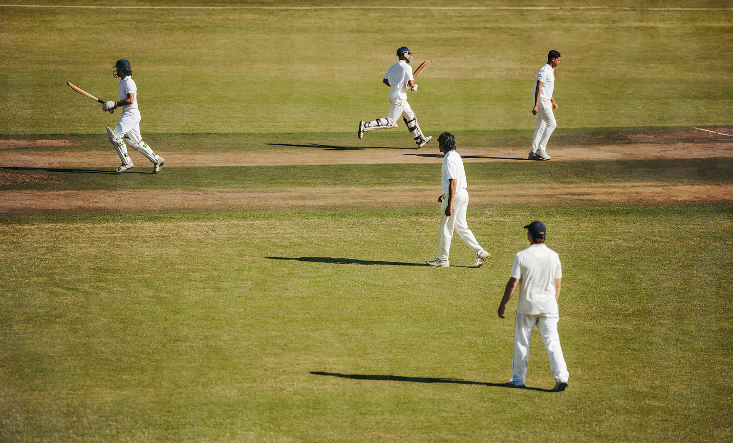 Players actively participating in a cricket match on a well-maintained grass field under daylight.