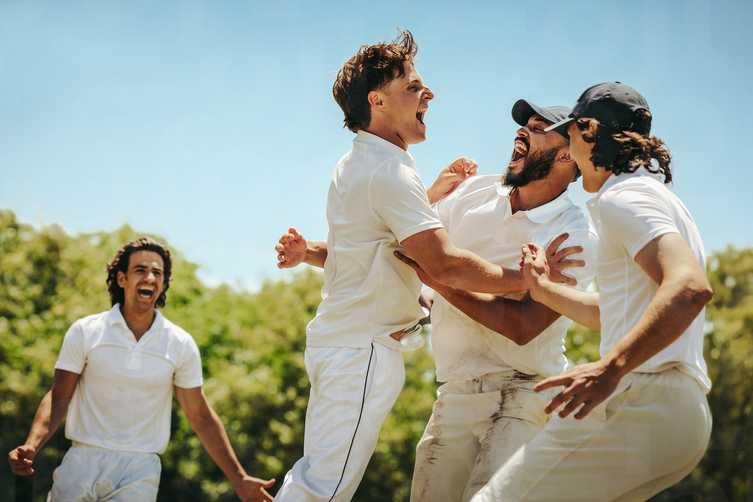 Energetic young male cricketers displaying excitement and camaraderie during a team victory celebration.