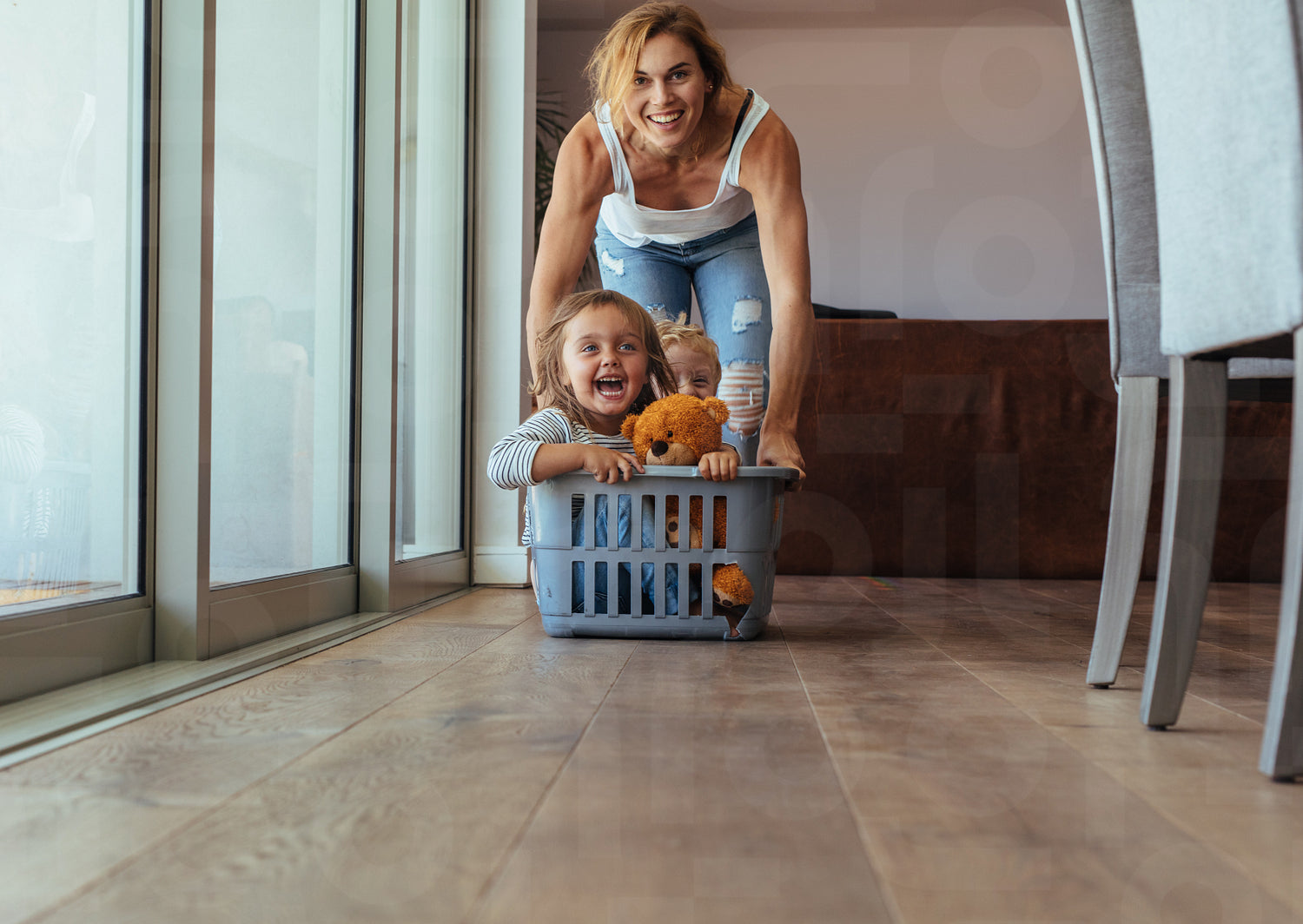 Happy young woman pushing kids sitting in washing basket. Children enjoying laundry basket ride at home.