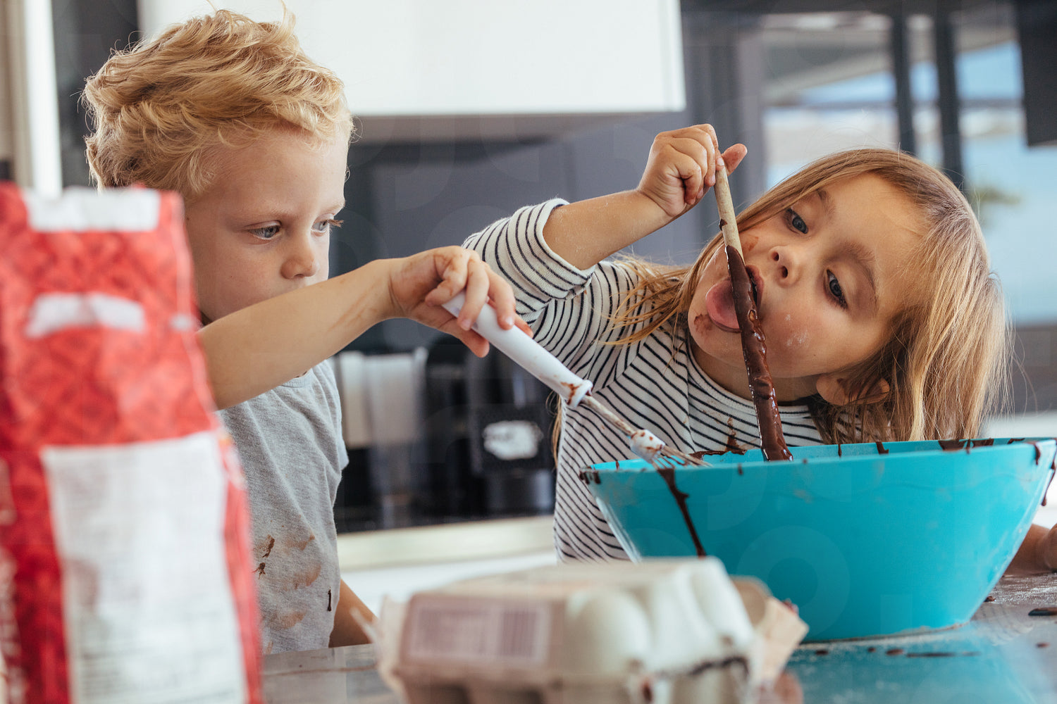 Little kids mixing batter in a bowl for baking, with girl licking a spoon. Children baking in the kitchen.