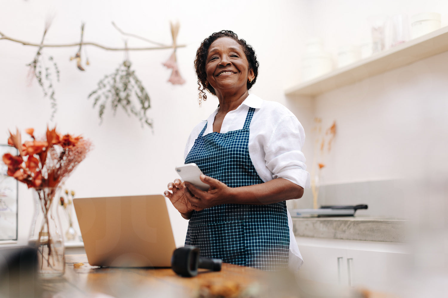 Happy business woman holds a smartphone in her flower store, staying connected with customers and managing her business on the go. Mature black craftswoman running a successful small business.