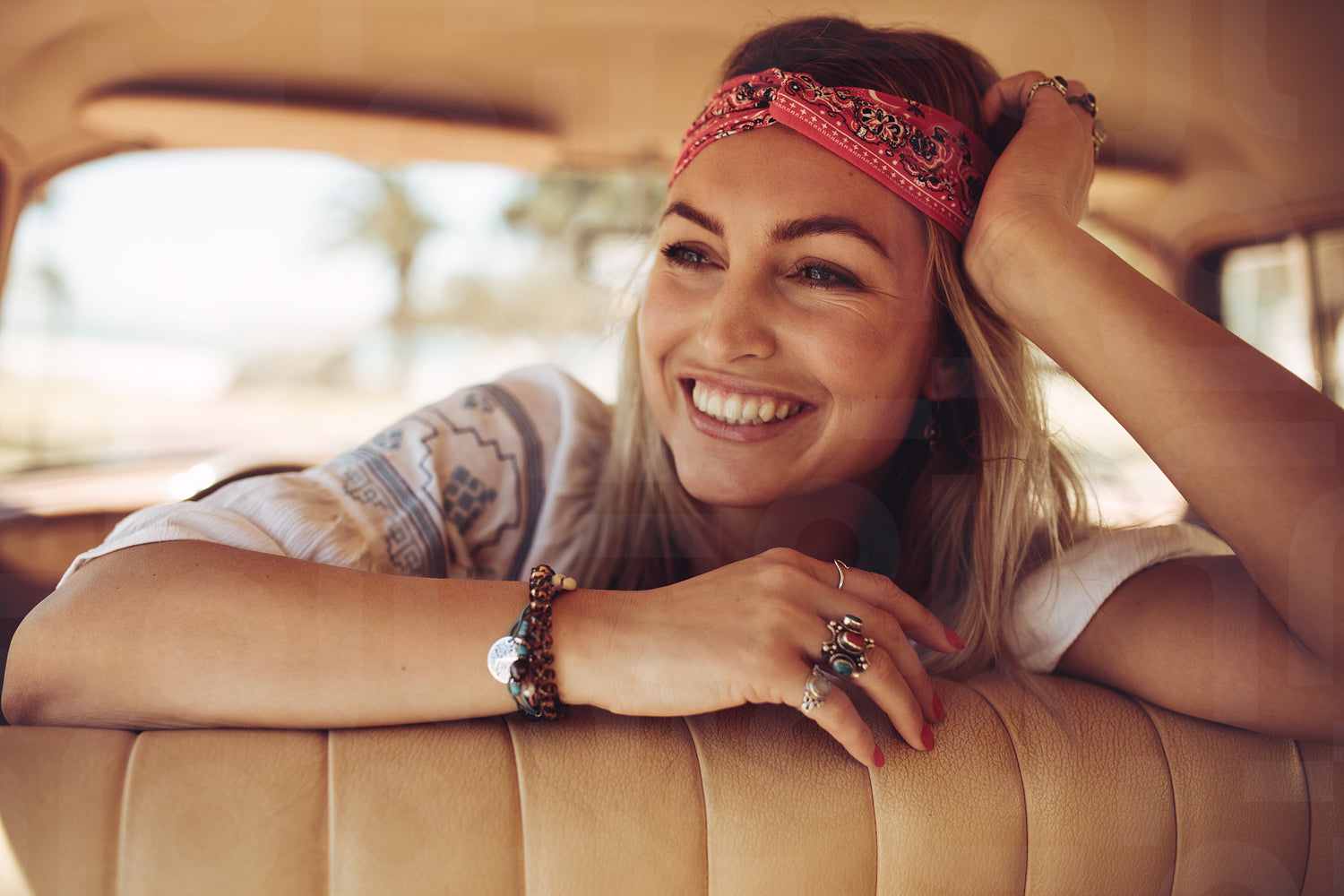Cheerful young woman sitting in the car and looking away. Female wearing bandana relaxing in a old car and smiling.