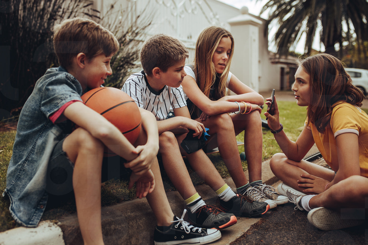 Boys and girls sitting on the pavement and talking. Girl sitting down on the edge of a street showing her mobile phone to her friends.