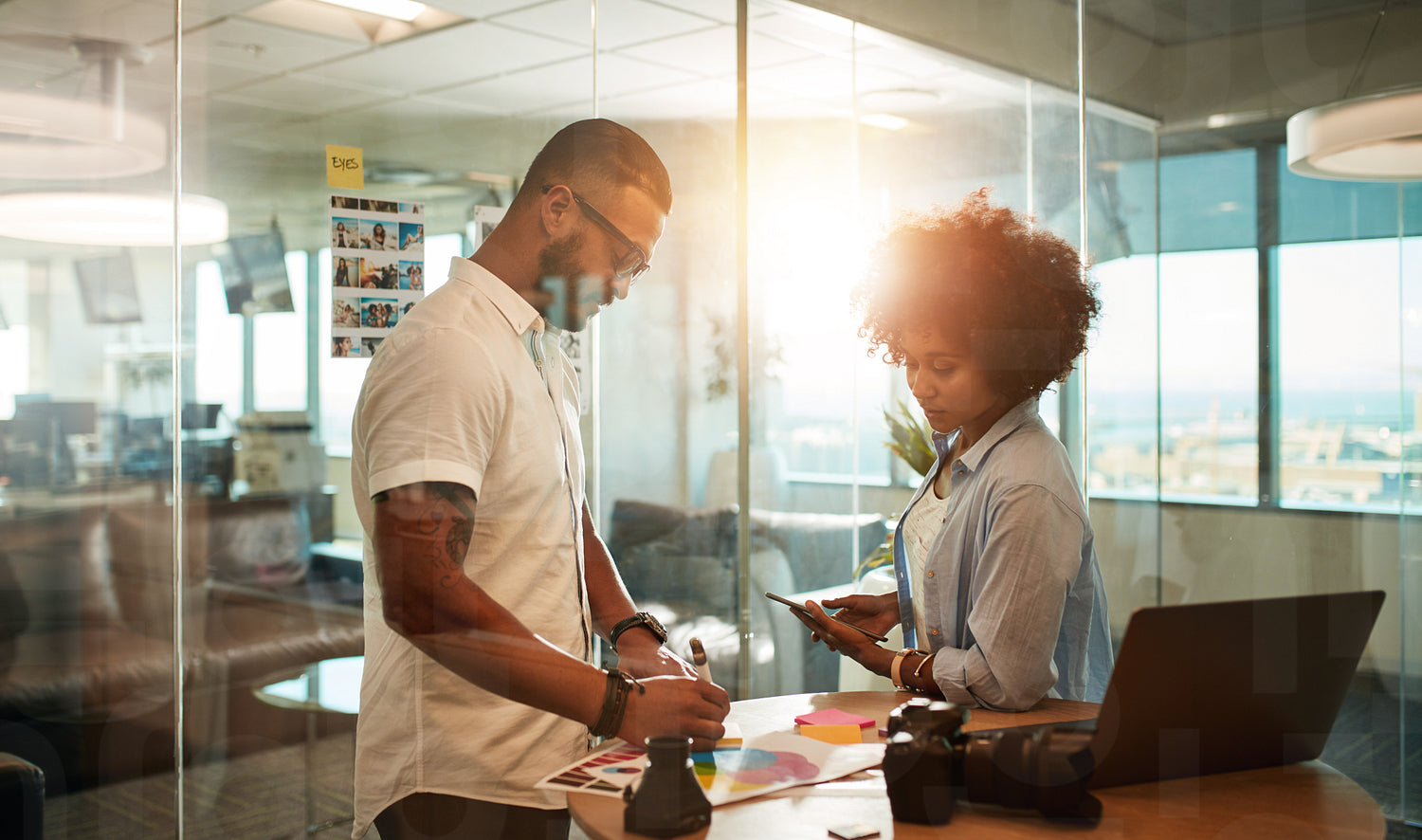 Two young photographers discussing shooting plan at creative workplace. Design professionals working together in modern office.