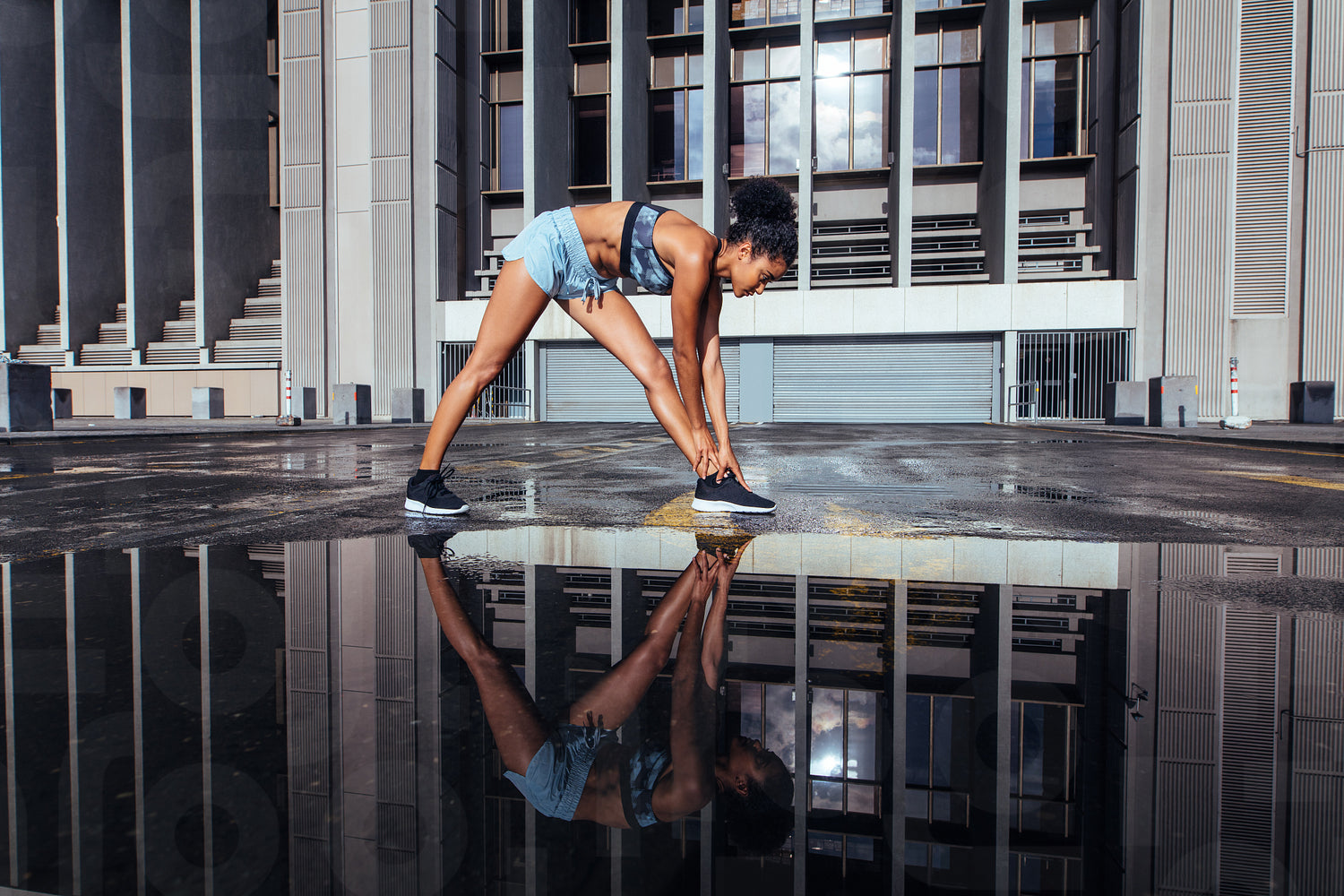 Woman runner doing warm up exercises outdoors. Reflection of woman athlete on water surface in front of a large city building.