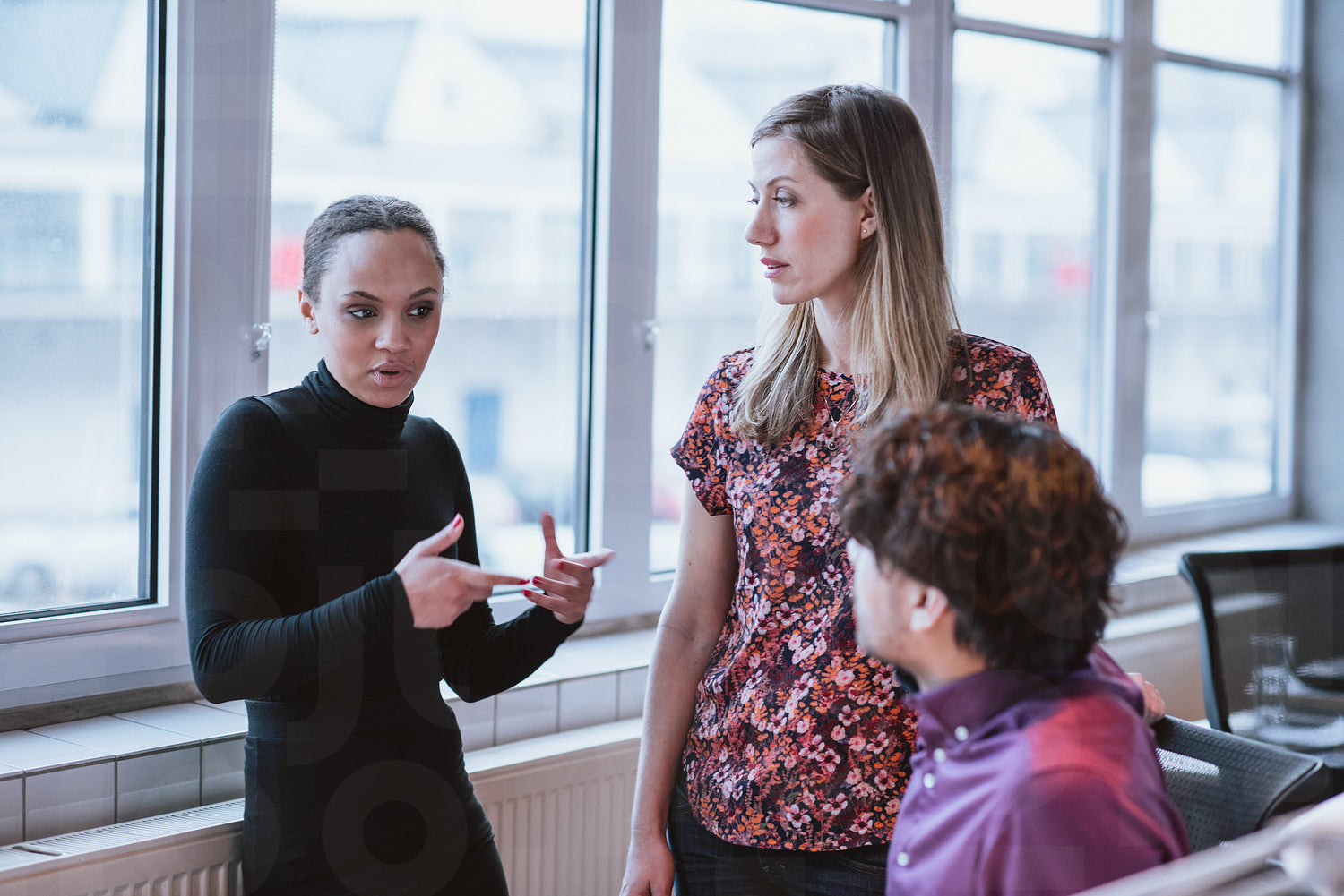 Young woman explaining business strategy to colleagues. Multiracial businesspeople discussing work in office.