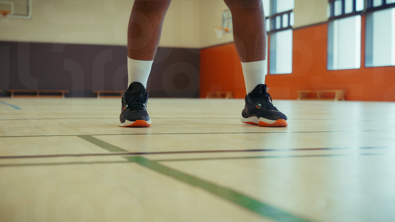 View of a person's legs and shoes as they expertly dribble a basketball on an empty court. The dynamic motion captures the essence of skill development in sports.