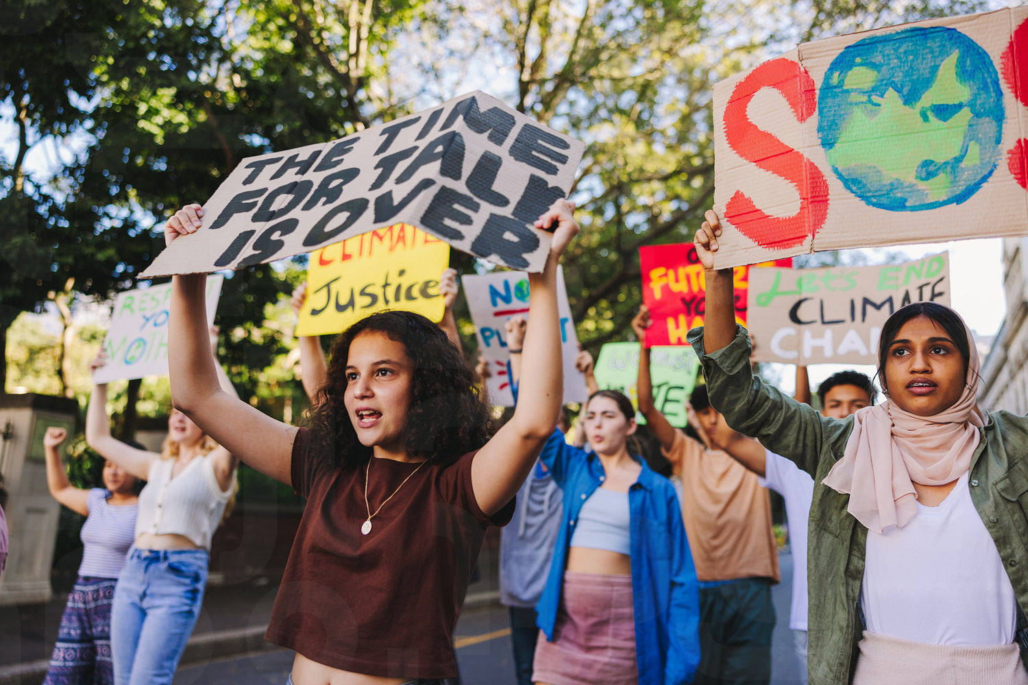 Group of teenagers standing up against climate change and global warming. Multicultural youth activists protesting with posters and banners. Diverse teenagers joining the global climate strike.