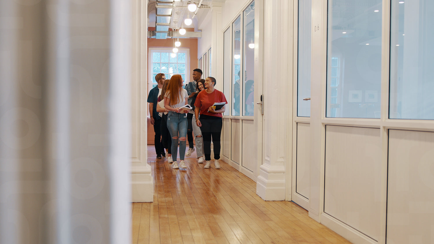 Group of university students going for lecture. Smiling girls and boys with books walking through college corridor.