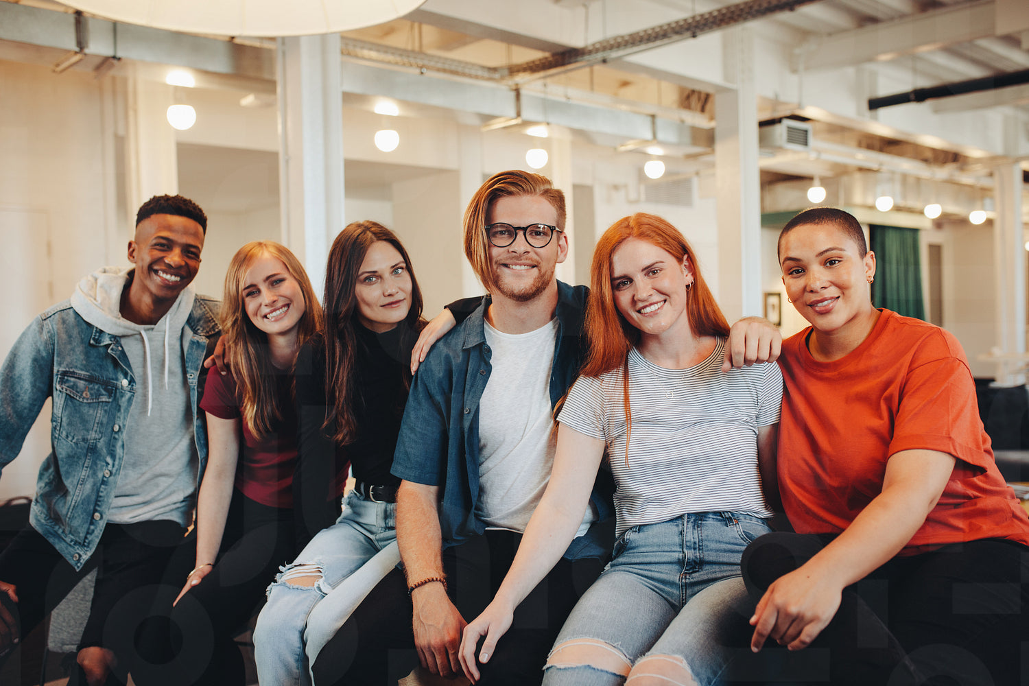 Portrait of diverse group of students in college. High school students together sitting in campus.