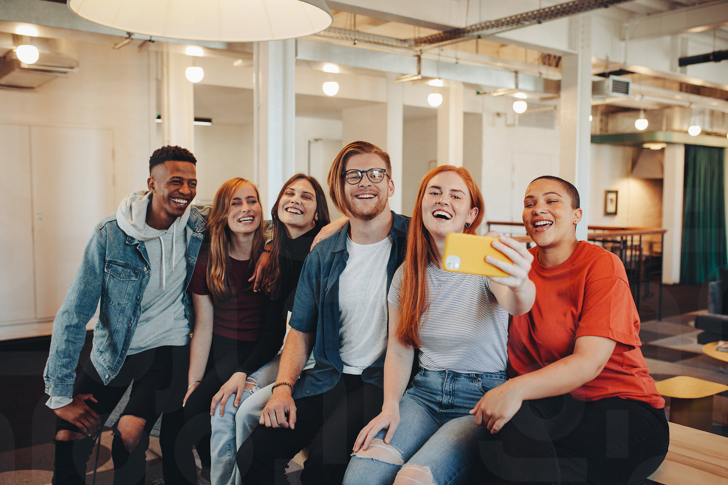 Group of college students making a selfie with smart phone in classroom. Young people in lecture room taking selfie with mobile phone.