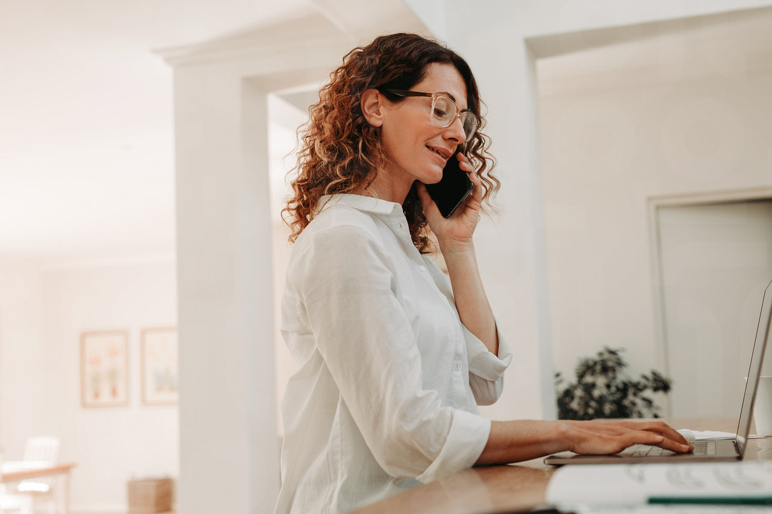Happy woman working on laptop and talking over cell phone at home. Businesswoman sitting at table and working.