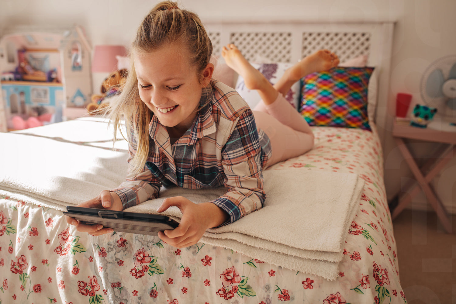 Girl in her room using digital tablet