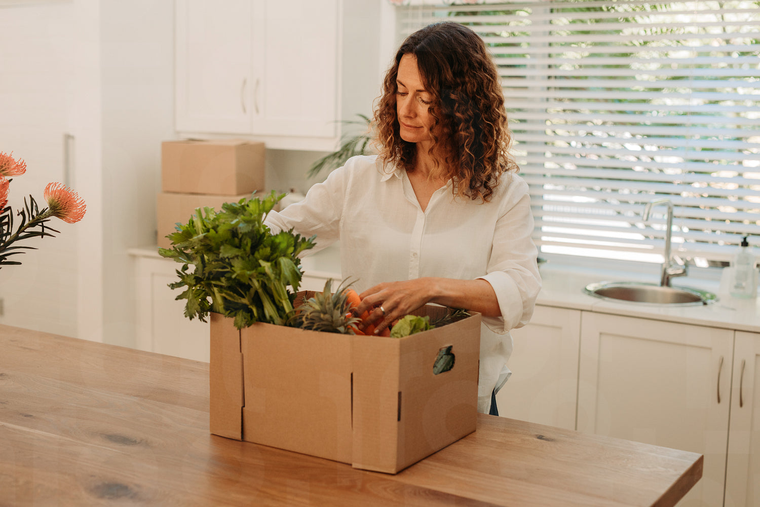 Female checking over the fruits and vegetables that have just arrived. Woman looking in the cardboard box of groceries from delivery in kitchen.
